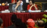 Ketua Umum PDI Perjuangan Megawati Soekarnoputri (kanan) bersama Ketua DPP Bidang Pemerintahan dan Pertahanan Keamanan Puan Maharani (kiri) berbincang pada acara penetapan pasangan calon kepala daerah dan wakil kepala daerah yang didukung dalam pemilihan kepala daerah (Pilkada) 2020 di DPP PDI Perjuangan, Menteng, Jakarta, Rabu (19/2). (FOTO : Republika/Putra M. Akbar)