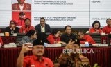 Ketua Umum PDI Perjuangan Megawati Soekarnoputri (kedua kiri) bersama Sekjen PDI Perjuangan Hasto Kristyanto (kanan), Ketua DPP Bidang Pemerintahan dan Pertahanan Keamanan Puan Maharani (kiri) dan Kepala Situation Room M. Prananda Prabowo (kedua kanan) berbincang pada acara penetapan pasangan calon kepala daerah dan wakil kepala daerah yang didukung dalam pemilihan kepala daerah (Pilkada) 2020 di DPP PDI Perjuangan, Menteng, Jakarta, Rabu (19/2). (FOTO : Republika/Putra M. Akbar)