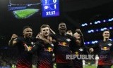 Tim Leipzig merayakan gol mereka pada laga leg pertama 16 besar Liga Champions antara Tottenham Hotspur dan Leipzig di Tottenham Hotspur Stadium, London, Kamis (20/2). (FOTO : Matt Dunham/AP )