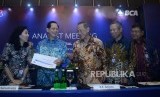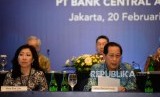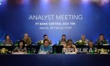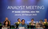 Presiden Direktur PT Bank Central Asia Tbk Jahja Setiaatmadja (kanan) bersama jajaran direksi dan komisaris BCA memberikan keterangan mengenai laporan keuangan full year 2019 di Jakarta, Kamis (20/2). (FOTO : Republika/Prayogi)