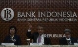 Gubernur Bank Indonesia Perry Warjiyo (tengah) bersama Deputi Gubernur Senior Destry Damayanti (kanan) dan Erwin Rijanyo, menyampaikan hasil Rapat Dewan Gubernur Bank Indonesia di Jakarta,Kamis (20/2/2020). (FOTO : PUSPA PERWITASARI/ANTARAFOTO)