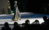 Model memakai busana karya Ina Priyono pada gelaran Muslim Fashion Festival 2020 di Jakarta Convention Center, Jakarta, Kamis (20/2). (FOTO : Republika/Thoudy Badai)