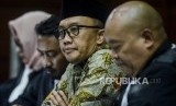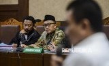 Terdakwa kasus dugaan suap terkait pengurusan proposal dana hibah Komite Olahraga Nasional Indonesia ( KONI) dan gratifikasi, Imam Nahrawi (kedua kiri) menyimak keterangan saksi dalam sidang lanjutan di Pengadilan Tipikor, Jakarta, Jumat (21/2). (FOTO : Republika/Putra M. Akbar)