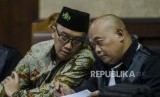 Terdakwa kasus dugaan suap terkait pengurusan proposal dana hibah Komite Olahraga Nasional Indonesia ( KONI) dan gratifikasi, Imam Nahrawi berbincang dengan kuasa hukumnya dalam sidang lanjutan di Pengadilan Tipikor, Jakarta, Jumat (21/2). (FOTO : Republika/Putra M. Akbar)