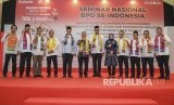 Gubernur DKI Jakarta Anies Baswedan (kelima kiri) berfoto bersama Direktur Utama Bank DKI Zainuddin Mappa (kedua kiri), Ketua Asbanda Supriyatno (ketujuh kiri), Deputi Komisioner Pengawas Perbankan IV Ahmad Soekro Tratmono (keenam kiri) serta Pejabat BPD lainnya pada acara Seminar Nasional BPD Se-Indonesia di Jakarta, Sabtu (22/2/2020). (FOTO : Antara/Muhammad Adimadja)