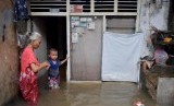 Seorang nenek menuntun cucunya di depan rumahnya yang terendam banjir di Jalan Anyer, Menteng, Jakarta, Minggu (23/2/2020). (FOTO : ANTARA FOTO)
