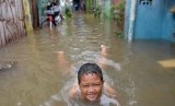 Seorang bocah bermain air banjir yang merendam Jalan Anyer di Menteng, Jakarta, Minggu (23/2/2020). (FOTO : ANTARA FOTO)
