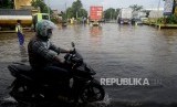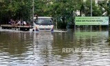 Sejumlah kendaraan melintasi banjir di Kawasan Berikat Nusantara (KBN), Cilincing, Jakarta, Senin (24/2). (FOTO : Republika/Prayogi)