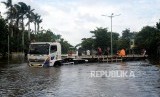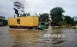 Truk melintasi banjir di Kawasan Berikat Nusantara (KBN), Cilincing, Jakarta, Senin (24/2). (FOTO : Republika/Prayogi)