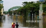 Pekerja melintasi banjir di Kawasan Berikat Nusantara (KBN), Cilincing, Jakarta, Senin (24/2). (FOTO : Republika/Prayogi)