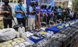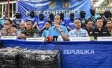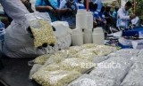 Petugas menunjukkan sejumlah barang bukti saat konferensi pers pengungkapan rumah produksi narkoba di Jalan Cingised, Kelurahan Cisaranten Endah, Kecamatan Arcamanik, Senin (24/2). (FOTO : Republika/Abdan Syakura)