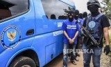 Petugas menggiring tersangka saat konferensi pers pengungkapan rumah produksi narkoba di Jalan Cingised, Kelurahan Cisaranten Endah, Kecamatan Arcamanik, Senin (24/2). (FOTO : Republika/Abdan Syakura)
