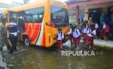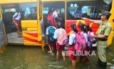 Petugas Dinas Perhubungan dan Satpol PP mengevakuasi sejumlah siswa dari banjir menggunakan Bus Sekolah di SD 2 Setrokalangan, Kudus, Jawa Tengah, Senin (24/2/2020). (FOTO : Antara/Yusuf Nugroho)