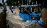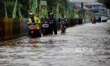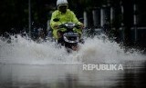 Pengendara mendorong kendaraannya melewati genangan air di Jalan Dr. Sutomo, Pasar Baru, Jakarta, Selasa (25/2). (FOTO : Republika/Thoudy Badai)