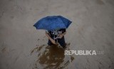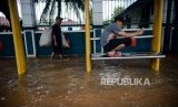 Warga berjalan melewati genangan air di Jalan Dr. Sutomo, Pasar Baru, Jakarta, Selasa (25/2). (FOTO : Republika/Thoudy Badai)