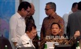 Menko Polhukam Mahfud MD (kanan), Menko PMK Muhadjir Effendy (kedua kiri), Menko Perekonomian Airlangga Hartarto (kedua kanan), Menkes Terawan Agus Putranto (tengah) dan Ketua Dewan Komisioner OJK Wimboh Santoso tiba untuk mengikuti rapat terbatas di Kantor Presiden, Jakarta, Selasa (25/2/2020). (FOTO : SIGID KURNIAWAN/ANTARA FOTO)