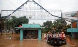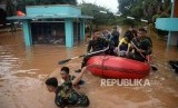 Personil TNI mengevakuasi warga yang rumahnya terendam banjir di Perumahan Bumi Nasio Indah, Bekasi, Jawa Barat, Selasa (25/2). (FOTO : Republika/Prayogi)