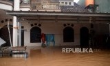 Warga bertahan di rumah mereka ketika banjir melanda Perumahan Bumi Nasio Indah, Bekasi, Jawa Barat, Selasa (25/2). (FOTO : Republika/Prayogi)