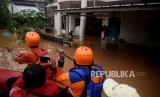 Petugas mengevakuasi warga yang rumahnya terendam banjir di Perumahan Bumi Nasio Indah, Bekasi, Jawa Barat, Selasa (25/2). (FOTO : Republika/Prayogi)