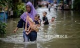 REPUBLIKA.CO.ID, JAKARTA -- Warga berjalan melintasi area yang terendam banjir di Jalan Satria IV, Kelurahan Jelambar, Jakarta Barat, Selasa (25/2).