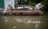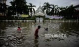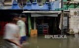Warga beraktifitas di area yang terendam banjir di Jalan Satria IV, Kelurahan Jelambar, Jakarta Barat, Selasa (25/2). (FOTO : Republika/Thoudy Badai)