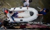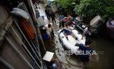 Sejumlah warga mengevakuasi seorang warga di area yang terendam banjir di Jalan Satria IV, Kelurahan Jelambar, Jakarta Barat, Selasa (25/2). (FOTO : Republika/Thoudy Badai)