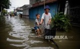 Warga mendorong sepedanya melewati genangan air di Jalan Satria IV, Kelurahan Jelambar, Jakarta Barat, Selasa (25/2). (FOTO : Republika/Thoudy Badai)