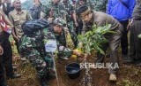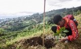 Bupati Bandung Dadang M Nasser menanam pohon saat Gerakan Bulan Menanam 2020 di Kawasan Bandung Utara (KBU), Desa Mekar Saluyu, Kecamatan Cimenyan, Kabupaten Bandung, Selasa (25/2). (FOTO : Republika/Abdan Syakura)