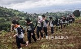 Sejumlah pelajar berjalan membawa tanaman saat Gerakan Bulan Menanam 2020 di Kawasan Bandung Utara (KBU), Desa Mekar Saluyu, Kecamatan Cimenyan, Kabupaten Bandung, Selasa (25/2). (FOTO : Republika/Abdan Syakura)