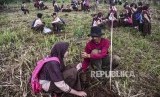 Sejumlah pelajar didampingi petani menanam pohon saat Gerakan Bulan Menanam 2020 di Kawasan Bandung Utara (KBU), Desa Mekar Saluyu, Kecamatan Cimenyan, Kabupaten Bandung, Selasa (25/2). (FOTO : Republika/Abdan Syakura)