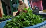 Warga memetik daun beluntas untuk selanjutnya dikeringkan dan dijadikan teh di Desa Ngrandu Lor, Kecamatan Peterongan, Kabupaten Jombang, Jawa Timur, Rabu (26/2/2020). (FOTO : ANTARA FOTO)