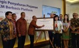 Penandatanganan kerja sama antara Bank Mandiri bersama 16 platform digital untuk menjadi lembaga penyalur kredit UMKM Bank Mandiri di Mandiri Club, Jakarta, Rabu (26/2). (FOTO : Republika/Dedy D Nasution )