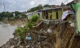 Warga mengamati rumahnya yang ambles akibat terkikis aliran kali daerah Teluk Pucung, Bekasi Utara, Jawa Barat, Rabu (26/2/2020). (FOTO : ANTARA FOTO)
