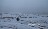Seorang pria dengan latar salju yang turun di Provinsi Tabuk, Saudi Arabia, Selasa (25/2). (FOTO : Mohamed Al Sultan/Reuters)