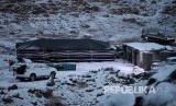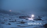 Tenda didirikan di dekat mobil yang diparkir saat salju turun di Provinsi Tabuk, Saudi Arabia, Selasa (25/2). (FOTO : Mohamed Al Sultan/Reuters)