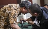 Terdakwa tindak pidana korupsi kredit modal Bank SumselBabel (BSB) tahun 2014 Augustinus Judianto (kiri) berbincang dengan kuasa hukumnya saat menjalani sidang putusan di Pengadilan Tipikor Palembang, Sumatera Selatan, Kamis (27/2/2020). (FOTO : NOVA WAHYUDI/ANTARA FOTO)