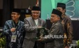 Ketua Dewan Pertimbangan MUI Din Syamsuddin (kedua kiri) menerima cinderamata dari Wakil Ketua Umum MUI Muhyiddin Junaidi usai (kedua kanan) Sidang Pleno Kongres Umat Islam Indonesia (KUII) VII di Pangkal Pinang, Kepulauan Bangka Belitung, Kamis (27/2). (FOTO : Republika/Putra M. Akbar)