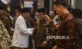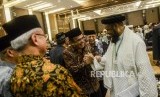 Menteri Agama Fachrul Razi (tengah) bersalaman dengan Ketua Yayasan Al-Fatih Kaafah Nusantara (AFKN) Ustaz Fadlan Garamatan (kanan) usai penutupan Kongres Umat Islam Indonesia (KUII) VII di Pangkal Pinang, Bangka Belitung, Jumat (28/2). (FOTO : Republika/Putra M. Akbar)