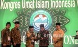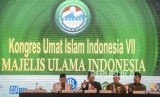 Ketua MUI Bidang Hukum dan Perundang-undangan Basri Bermanda (kedua kiri) bersama Ketua MUI Jawa Timur KH. Abdusshomad Buchori (kiri) dan Sekjen MUI Anwar Abbas (kedua kanan) saat menyampaikan hasil kerja komisi pada Kongres Umat Islam Indonesia (KUII) VII di Pangkal Pinang, Bangka Belitung, Jumat (28/2). (FOTO : Republika/Putra M. Akbar)