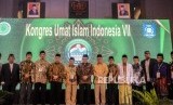 Menteri Agama Fachrul Razi (tengah) bersama Gubernur Kepulauan Bangka Belitung Erzaldi Rosman Djohan, Wakil Ketua Umum MUI Muhyiddin Junaidi beserta jajaran foto bersama usai penutupan Kongres Umat Islam Indonesia (KUII) VII di Pangkal Pinang, Bangka Belitung, Jumat (28/2). (FOTO : Republika/Putra M. Akbar)