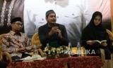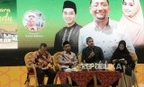 (dari kiri) Novelis Habiburrahman El Shirazy, Pemain Film Cholidi Asadil Alam dan Oki Setiana Dewi saat Meet & Greet dan Bedah Buku Kembara Rindu dalan ajang Islamic Book Fair (IBF) ke-19 di Jakarta Convention Center, Sabtu (29/2). (FOTO : Republika/Prayogi)