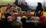 (dari kiri) Moderator Irwan Kelana, Novelis Habiburrahman El Shirazy, Pemain Film Cholidi Asadil Alam dan Oki Setiana Dewi saat Meet & Greet dan Bedah Buku Kembara Rindu dalan ajang Islamic Book Fair (IBF) ke-19 di Jakarta Convention Center, Sabtu (29/2). (FOTO : Republika/Prayogi)