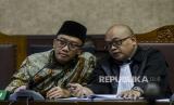 Terdakwa kasus dugaan suap terkait pengurusan proposal dana hibah Komite Olahraga Nasional Indonesia ( KONI) dan gratifikasi, Imam Nahrawi berbincang dengan kuasa hukumnya dalam sidang lanjutan di Pengadilan Tipikor, Jakarta, Jumat (21/2). (FOTO : Republika/Putra M. Akbar)
