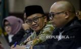 Terdakwa kasus dugaan suap terkait pengurusan proposal dana hibah Komite Olahraga Nasional Indonesia ( KONI) dan gratifikasi, Imam Nahrawi (kedua kanan) menyimak keterangan saksi dalam sidang lanjutan di Pengadilan Tipikor, Jakarta, Jumat (21/2). (FOTO : Republika/Putra M. Akbar)