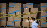 Petugas kepolisian Polda Metro Jaya melintasi barang bukti saat rilis dugaan penimbunan masker di gudang di Neglasari, Kota Tangerang, Banten, Rabu (4/3/2020). (FOTO : Antara/Fauzan)