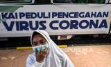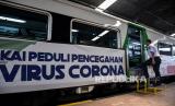 REPUBLIKA.CO.ID, BANDUNG -- Calon penumpang kereta api beraktivitas di samping kereta inspeksi yang dipasang iklan sosialisasi pencegahan penyebaran virus corona (Covid-19) di Stasiun Bandung, Kota Bandung, Kamis (5/3).