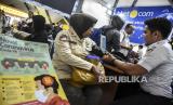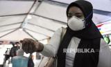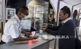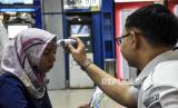 Petugas Kesehatan memeriksa kesehatan calon penumpang menggunakan alat thermo gun di Stasiun Bandung, Kota Bandung, Kamis (5/3). (FOTO : Republika/Abdan Syakura)