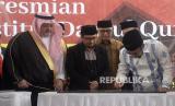 Menag Fachrul Razi (kanan) membubuhkan tanda tangan disaksikan bersama Dubes Arab Saudi Untuk Indonesia Essam bin Abid Al Thagafi (kiri), Pimpinan Umum Daarul Quran Yusuf Mansyur saat meresmikan kampus Daarul Quran di Tangerang, Banten, Kamis (5/3). (FOTO : Republika/Prayogi)