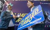 Regional Group Head Central Region XL Axiata Rd. Sofia Purbayanti (kiri) dan Head of Sales Area Bandung Arif Farhan Budiyanto meluncurkan fitur Xtra Unlimited Turbo di Bandung, Jawa Barat, Kamis (5/3/2020). (FOTO : Antara/M Agung Rajasa)