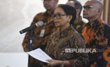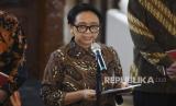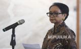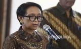 Menteri Luar Negeri Retno LP Marsudi memberikan pernyataan pers terkait larangan masuk sementara bagi warga negara asing ke Indonesia di Kantor Kementerian Luar Negeri Jakarta, Kamis (5/3/2020). (FOTO : Antara/Wahyu Putro A.)